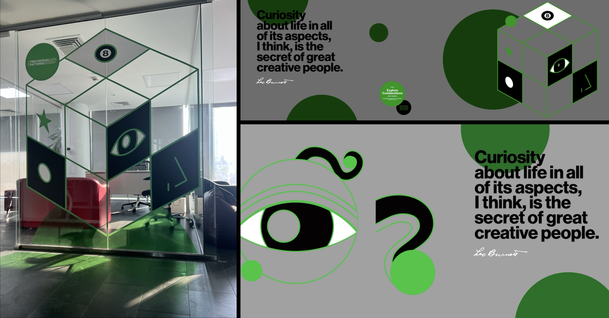 Rather than introducing a new identity, the project focused on activating the agency’s creative culture from within. Inspired by James Webb Young’s Five Techniques for Producing Ideas, we developed a visual journey of “steps” that creatives could encounter throughout the office. Each step acted as a quiet prompt, encouraging reflection, experimentation, and momentum at different moments in the creative process.